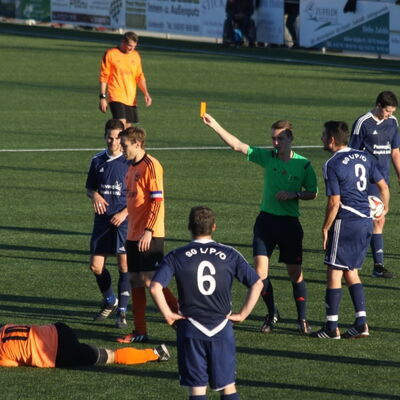 In der 57. Min. war es dann wie in der ersten Halbzeit ein Spieler der SG, der mit einem Distanzschuss aufs Ahbacher Gehäuse abschloss. Was hier im ersten Moment als leichte Beute aussah, wurde durch die tiefstehende Sonne zur gefährlichen Torchance, die TuS Keeper Christian Rieder mit den Fingerspitzen über das Tor lenkte. Neun Minuten später war dann die Spielzeit des Eigentorschützen der SG Lambertsberg vorbei, als er ohne Chance den Ball zu erreichen Robin Daniels von hinten in die Parade fuhr und zurecht die Rote Karte sah.