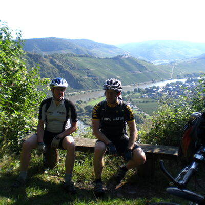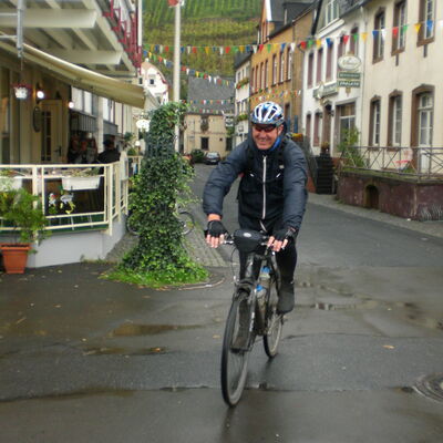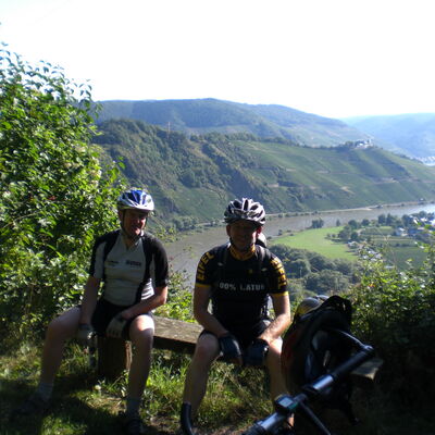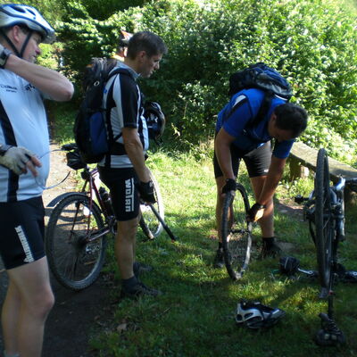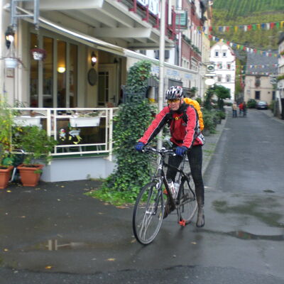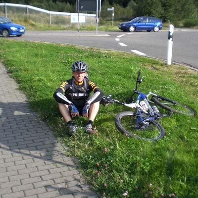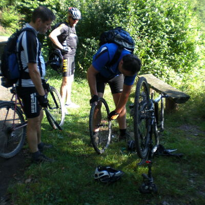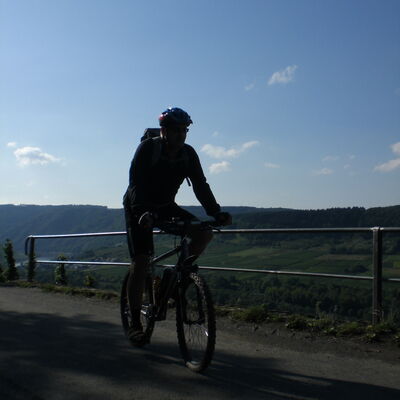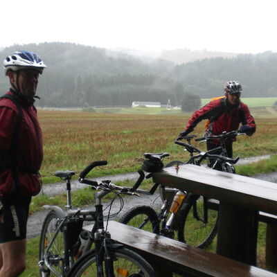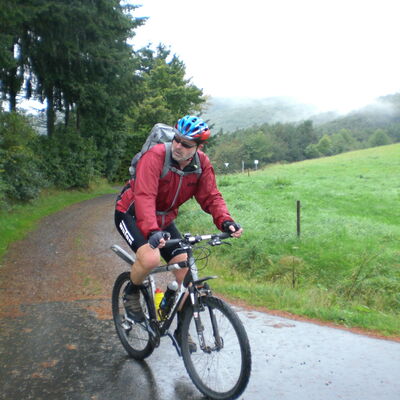 Bei Dauerregen starten in Richtung Kelberg. Von hier folgen wir der Vulkan-Rad-Route bis Ulmen. Ab hier querfeldein an Auderath, Schmitt, Gillenbeuren vorbei bis nach Weiler. Immer noch starker Regen. Nun geht's ins Weilerbachtal, zum Forsthaus Sommet und weiter nach Beuren. Über flowige Forst- und Weinbergtrails kommen wir zur Mosel nach Alf. Über Bullay fahren wir durch die Weinberge bis nach Zell. Hier ist eine Bikewäsche an der Tankstelle und eine warme Dusche und "Nudelsalat" für die Biker im Hotel angesagt. Die Rücktour startet vielversprechend bei strahlendem Sonnenschein und angenehmen Temperaturen. Doch nach dem ersten Anstieg zur Marienburg, haben die ersten Pannen ihren Anfang. Weiter geht's Richtung Kinderbeuren-Hetzhof steil bergauf, durch den Gondelwald nach Hontheim. Weiter durchs Alfbachtal fahren wir bis nach Strohn. Immer gestoppt durch Reifenpannen. Über Gillenfeld biken wir um die Dauner Maare nach Daun und durch den Rengener Wald nach Dockweiller. Nächste Panne - Felgenschaden. Jetzt aber schnell nach Üxheim ins "Stüffje" mit Mister Fit.