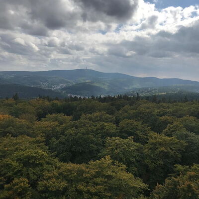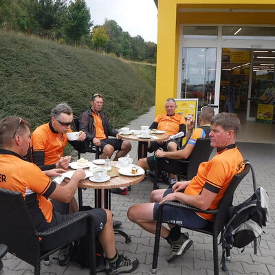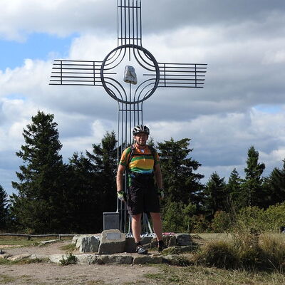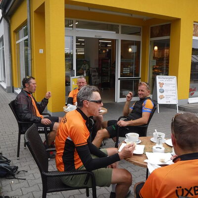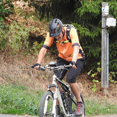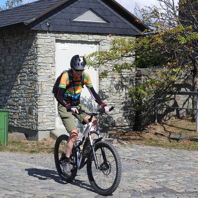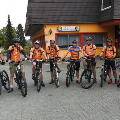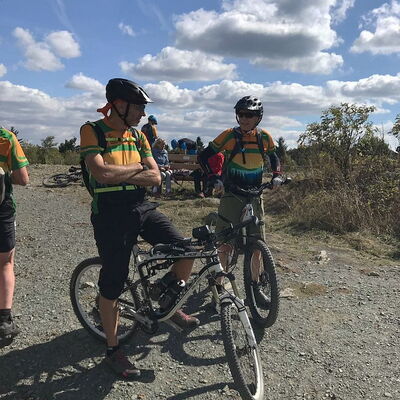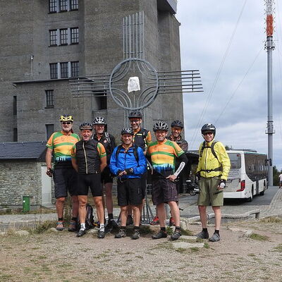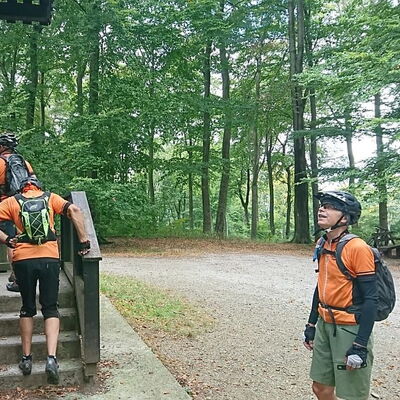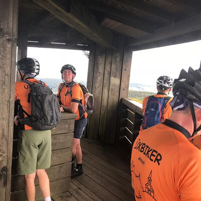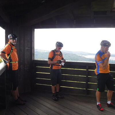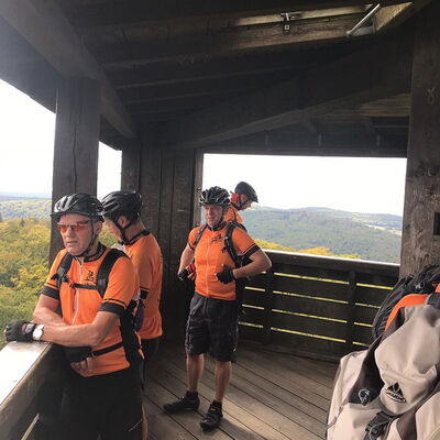 Freitagmittag starteten wir vom Hotel in Riedelbach durch die Riedelbacher Heide in Richtung Altweilnau. Von hier über einen Felsenpfad hinunter zur Landsteiner Mühle. Jetzt kamen die Anstiege, über Treisberg zum Pferdskopf, 663 m hoch, wo wir den 34m hohen Holzturm bestiegen und einen herrlichen Rundumblick hatten. Weiter fuhren wir über einige Trails und Waldwege zum Feldkopf und nach Seelenberg. Dann über Finsterthal und den Wolfsküppel zurück nach Riedelbach, wo es in der Discounterbäckerei leckeren Kuchen und Kaffee gab. Die Tachonadel zeigte 33 km und 850 Hm an.