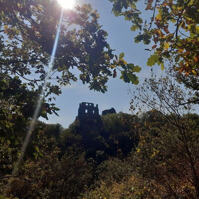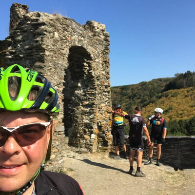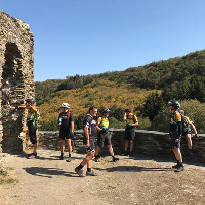 Der nächste Tag sollte es in sich haben. Am Morgen fuhren wir wieder mit Bike-Guide Friedhelm los. Durch einige Täler und Hügel ging es dann durch ein großes Waldgebiet bis rauf zum Idarkopf. Weiter über den Saar-Hunsrücksteig und einige Traumpfade bis Rhaunen und durchs Hahnenbachtal bis zur Schmidtburg. Hier war erst mal Pause. Von hier wieder runter ins Hahnenbachtal und rauf zur Keltensiedlung Altburg. Gleich in der Nähe war dann auch noch das Besucherbergwerk Herrenberg. Hier wurde Schiefergestein abgebaut. Kaffee, Kuchen und sonstige Erfrischungsgetränke gab es auch hier. Jetzt gings an den Rückweg, immer entlang des Kyrbachs, (nicht der in Üxheim), aber trotzdem immer hoch und wieder runter. Puuh! Und zum Abschluß der Samstagstour, noch an der Burgruine Dill vorbei, hoch zum Limes Wachturm oberhalb von Niedersohren. Wieder angekommen in Sohren im Hotel Felsenkeller, gab es dann einige Erfrischungsgetränke zur Belohnung, für die tolle, anstrengende Bike-Tour.
