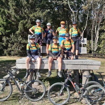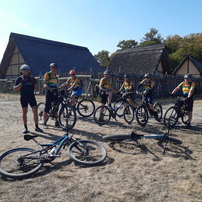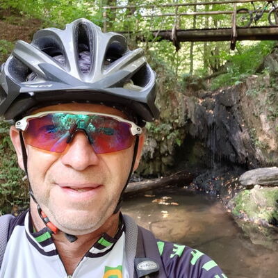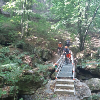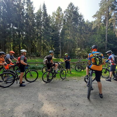 Los ging es am Freitag, nach kurzer Anreise, mit unseren Bike-Guide Friedhelm. Wir trafen uns am Hotel und fuhren über einige Wege und Pfade zum Waldsee. Hier gab es eine kurze Begrüßung und der heutige Tourverlauf wurde besprochen. Zunächst fuhren wir vorbei am Flughafen Hahn, leider heute ohne Flugbetrieb. Ab hier gings bergab. Entlang des Steierbach bis zum Rauschkümpel Wasserfall, mit wenig Wasser. Über Trails und alte Hohlwege weiter durch das Ahringsbachtal bis zur Mosel, nach Enkirch. Tolle Abfahrt. Doch wir mussten auch wieder bergauf. Ein langer Aufstieg, entlang des Großbach bis zur Siedlung Maiermund. Auf der Höhe weiter zur Siedlung Hohestein, wo wir im kleinen netten "Cafe Auszeit", unseren wohlverdienten Kuchen und sonstige Stärkungsmittel, zu uns nahmen. Frisch gestärkt fuhren wir wieder am Hahn vorbei bis zum Geographischen Mittelpunkt von Rheinland-Pfalz. Hier gabs noch ein Gruppenfoto, s.o. Über einige Waldtrails rollten wir zurück nach Sohren.